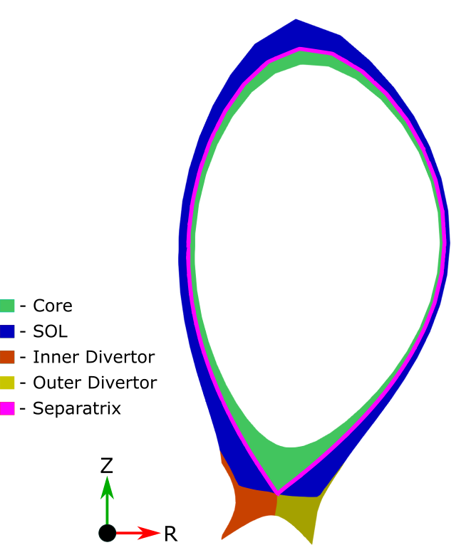 Tokamak ASDEX Upgrade: SOLPS simulation domain regions - grid subsets: Core, SOL, Inner Divertor, Outer Divertor and Seperatrix. (source: [Thesis]).