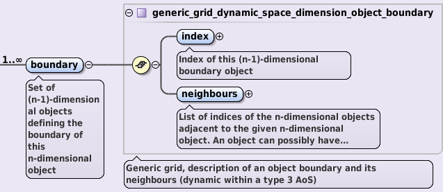 • objects_per_dimension AOS, holding definition of the space objects for every dimension. For example, objects_per_dimension(1) (note: Fortran notation, index starting with 1) holds the description on the 0D objects - points/nodes/vertices; objects_per_dimension(2) holds the description on 1D objects - lines/edges, objects_per_dimension(3) holds the description on 2D objects - surfaces, objects_per_dimension(4) holds information on 3D objects - volumes, etc.