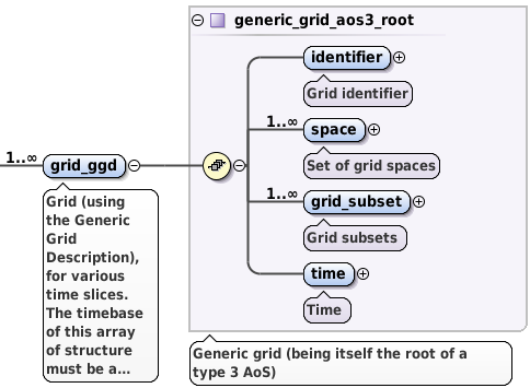 The ggd AOS holds the plasma quantities represented using the Generalized Grid Description for various time slices. The quantities correspond directly to one of the grid subsets (e.g. 100 values corresponding to grid subset composed by 100 points). ggd AOS contents differ between IDSs and usually it contains many child nodes/AOSs however the same rules apply to all.