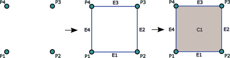 An example of the basic principle of the two-dimensional quadrilateral cell formation starting with four anti-clockwise assorted points P1, P2, P3, and P4 (a). Those points represent the edge boundary of the E1 to E4 edges (b), and are used for their formation, where the points P1 and P2 define the boundary of the edge E1, the points P2 and P3 define the boundary of the edge E2, etc. Then the same previously defined edges E1, E2, E3, and E4 define the boundary of the two-dimensional quadrilateral cell C1 (c). Each cell inside the grid is described the same way (source: [Thesis]).