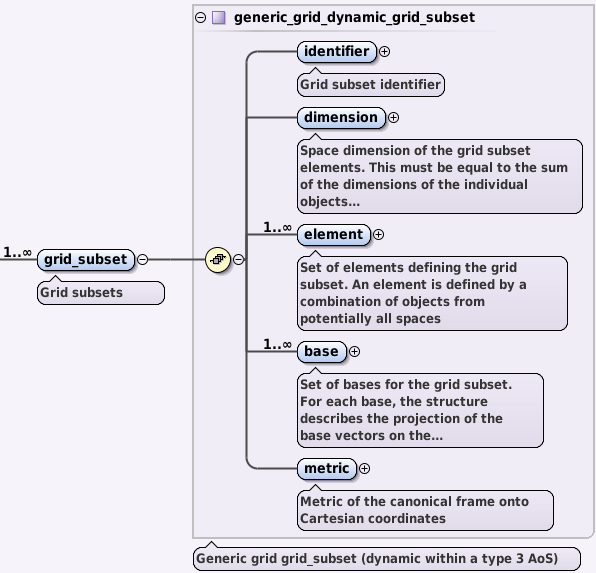 Overview of the grid_subset AOS and its children identifier node, dimension leaf, element AOS, base AOS and metric node. (as seen in the Oxygen XML Editor).