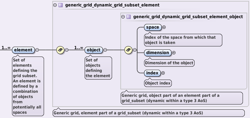 The element AOS is designed to contain data on each element of the same dimension, forming the grid subset. Each element can be formed by one or more objects and the data on the objects forming the element is stored in its child named object AOS. The relation between grid, grid subset, element, and object is shown in figure below.