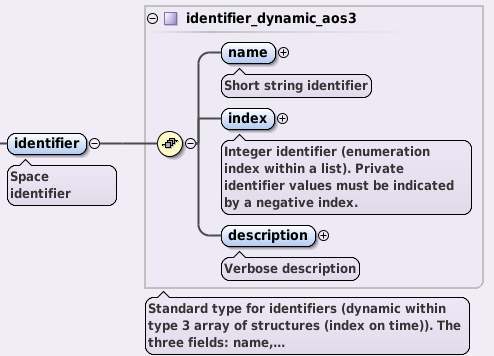 Overview of the space AOS displaying identifier node, geometry_type node, coordinates_types leaf and objects_per_dimension AOS (as seen in the Oxygen XML Editor).